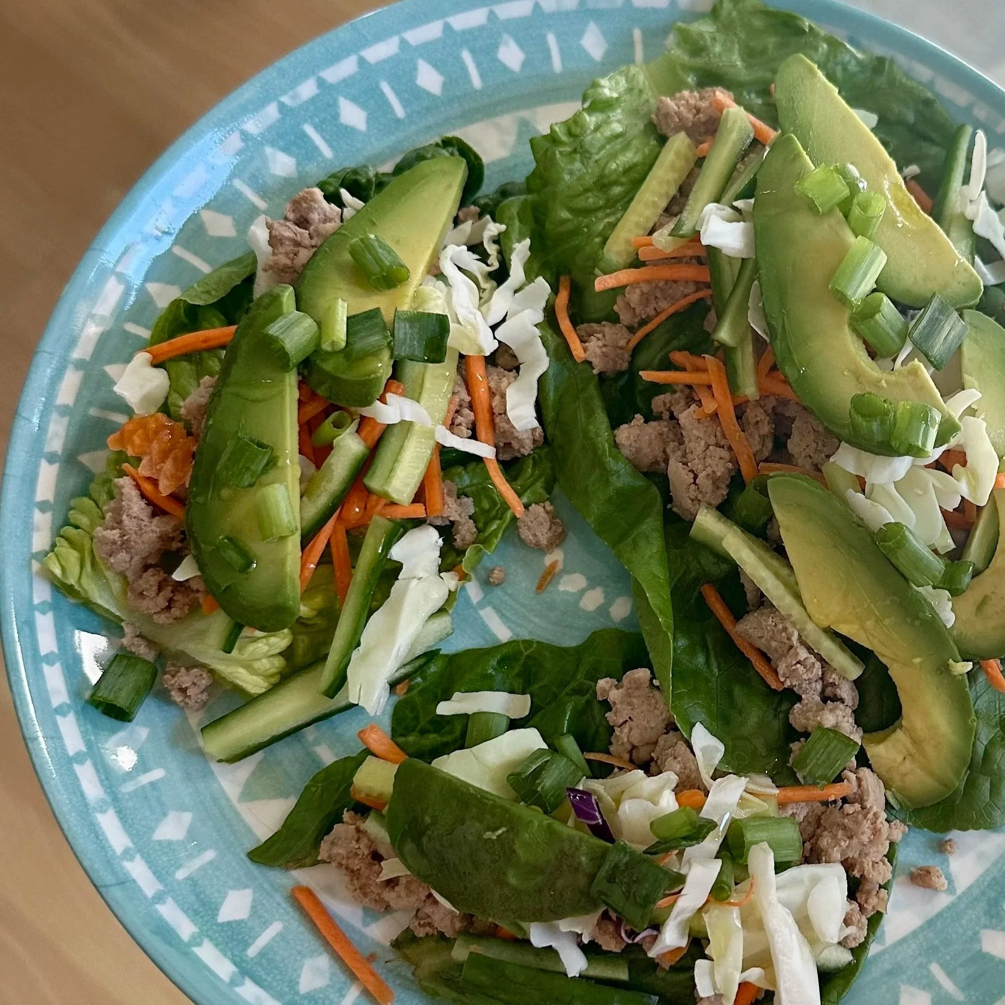 Lay out the lettuce leaves on a plate or tray. Spoon the warm turkey mixture into each leaf. Top with shredded carrots, cabbage, sliced cucumber, and avocado.Drizzle & top: